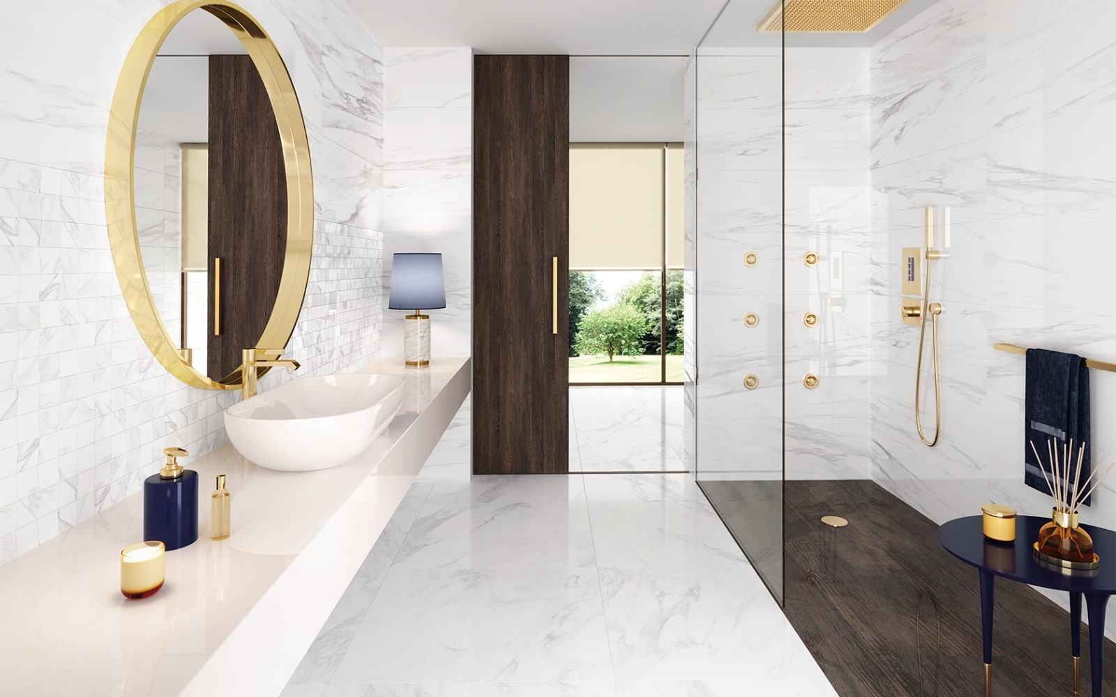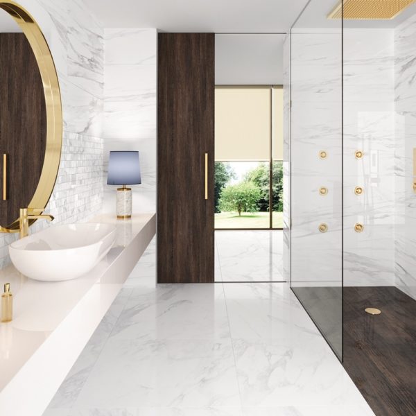 Marmor macht Eindruck, ist zeitlos schön und nach wie vor sehr beliebt. Konservativ? Kann er sein. Muss er aber nicht. Wie die „Marmor“ von Steuler Design. Diese gibt es in einer klassischen, glänzenden und einer modernen, matten Ausführung. Und: Die Kombination macht’s. Außer dem gediegenen Boden „Marble“ lässt sich die „Marmor“ auch mit dem Holzoptik-Feinsteinzeug „Schwarzwald“ kombinieren – eine überraschend lässige Verbindung. Prunkvolle Empfangshalle oder stilvolles Designer-Apartment? Die „Marmor“ kann beides.